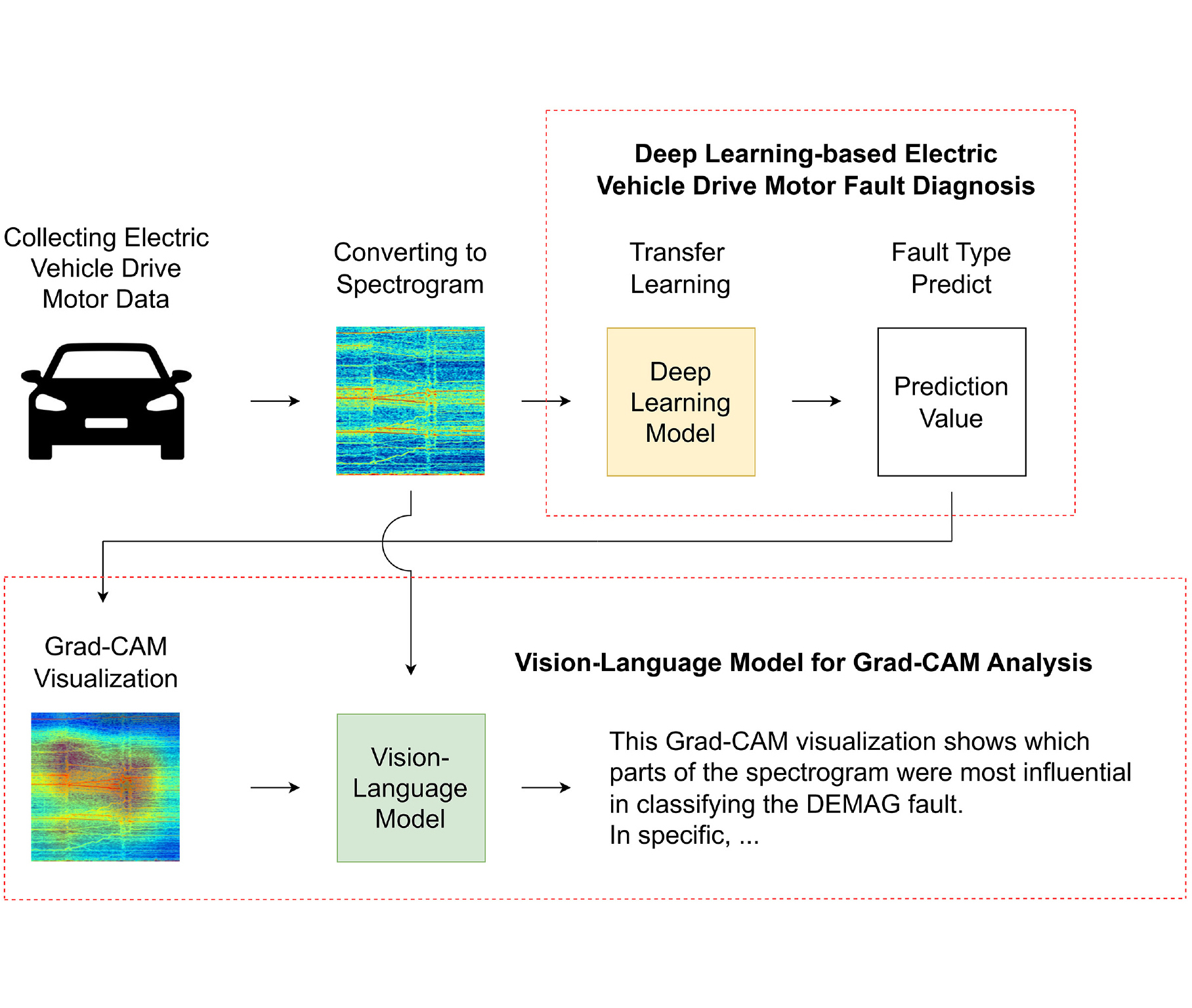 - With the increasing adoption of electric vehicles (EVs), ensuring the reliable operation of their drive motors has become a critical challenge. Motor faults can directly lead to reduced performance, safety hazards, and costly downtime. To address this need, deep learning-based automatic fault diagnosis models have been actively explored, particularly those converting vibration signals into spectrograms to leverage their powerful classification capabilities. While these models achieve high accuracy in distinguishing various fault types, they suffer from the critical limitation of black-box decision-making, which hinders interpretability and trust. To overcome this limitation, this study proposes a novel framework that applies gradient-weighted class activation mapping (Grad-CAM) to a ResNet-based spectrogram classifier, visually highlighting the model's decision basis, and then uses a vision-language model (VLM) to automatically generate intuitive natural language explanations for the highlighted regions. By feeding the Grad-CAM heatmaps along with spectrogram time–frequency data to the VLM, the framework enables automatic generation of human-readable explanations, reducing the expert burden while improving transparency and trustworthiness. Experiments were conducted using vibration data collected from a Hyundai Ioniq Electric vehicle covering five fault types. Comparative evaluations across eight deep learning architectures confirmed that the ResNet-based model achieved the best classification performance. Moreover, the natural language explanations generated by the VLM were qualitatively evaluated and found to be consistent and reasonable, demonstrating practical feasibility. The proposed approach is expected to contribute to the development of a reliable and intelligent maintenance system for EV drive motors. - COLLAPSE