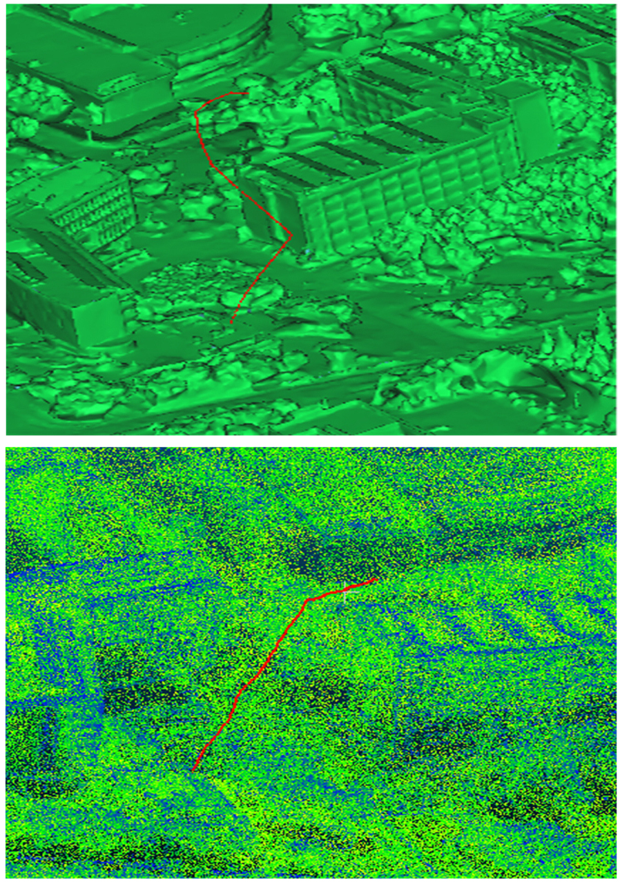 - This study explores the need for accurate and reliable 3D environment models that support safe autonomous navigation of unmanned aerial vehicles (UAVs). To evaluate suitable modeling techniques, we compare two representative approaches: the traditional Structure-from-Motion (SfM) and Multi-View Stereo (MVS) pipeline, which produces a 3D mesh, and the recently developed 3D Gaussian Splatting (3D GS) method, which expresses a scene using a large set of 3D Gaussians and renders it through differentiable splatting. Using a dataset of about 500 aerial images captured over the Semyung University campus, we construct both 3D models and evaluate their effectiveness by integrating them into an RRT*-based global path planning framework. Quantitative analysis reveals distinct performance differences between the two models: the 3D Mesh model generates shorter paths, fewer waypoints, and much faster planning time, while the 3D GS model produces longer paths, more waypoints, and slower planning time. These results suggest that the 3D Mesh model is more efficient and suitable for pre-flight planning, whereas the 3D GS model—despite higher computational cost—offers richer environmental detail that can support high-precision obstacle avoidance. Overall, this study highlights how the choice of 3D modeling can critically influence UAV navigation performance, particularly in terms of environmental awareness, obstacle detection fidelity, and operational safety. - COLLAPSE