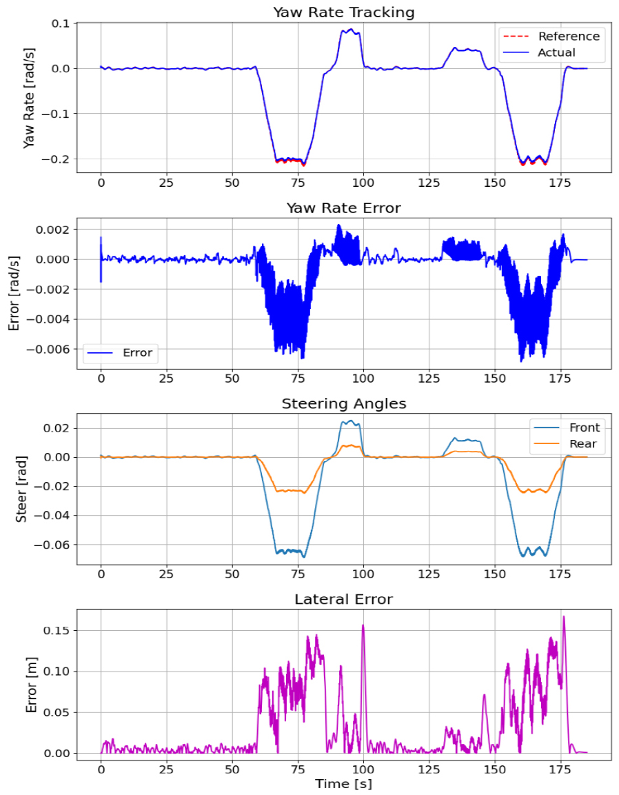 - Model-Based Yaw-Rate Tracking Control with Online Adaptation of Steering and Tire Parameters for an E-Corner-Based Four-Wheel Independent Steering Vehicle