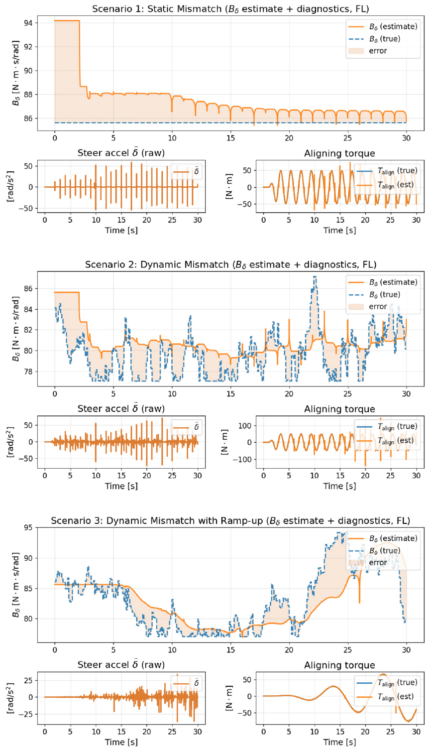 - This paper presents a model-based yaw-rate tracking control framework for an e-corner–based vehicle with four-wheel independent steering (4WIS). Owing to the over-actuated nature of the platform, accurate yaw-motion generation requires a consistent connection among vehicle yaw dynamics, tire lateral-force generation, and steering actuator dynamics. A hierarchical feedforward framework is developed to map a desired yaw-rate profile to the required yaw moment, allocate it to per-wheel lateral-force commands, and convert them into per-wheel steering angle and steering motor torque commands via an inverse actuator model. While feedforward control provides fast response and physical interpretability, its performance can degrade under steering actuator uncertainties, tire-parameter variations, and unmodeled disturbances.To mitigate these effects without introducing overly complex robust-control structures, a recursive least-squares (RLS)–based parameter adaptation scheme is integrated into the feedforward pipeline. The proposed method estimates and updates the key model parameters—namely the steering actuator viscous damping and the tire cornering stiffness—from input–output data, and uses the updated parameters to align the feedforward torque/steering command generation with the actual vehicle response. The proposed approach is evaluated in simulation under a deliberate 10% mismatch in the viscous damping and cornering stiffness parameters. Comparative studies are conducted for four configurations: feedforward only, feedforward with yaw-rate feedback, feedforward with RLS adaptation, and feedforward with both RLS adaptation and feedback. The results show that RLS-based adaptation improves yaw-rate tracking robustness under parameter uncertainty and reduces reliance on feedback compensation, achieving stable tracking performance across uncertainty scenarios. - COLLAPSE