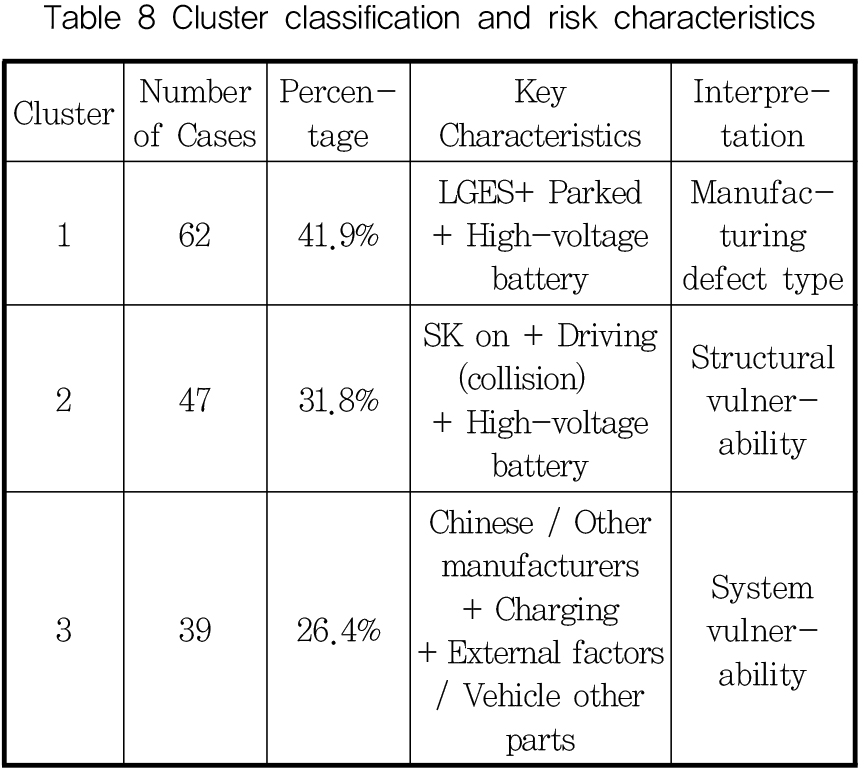 - This study investigates the structural characteristics and underlying risk factors of electric vehicle (EV) fires through a statistical analysis of 148 documented cases in South Korea between 2018 and 2024. While public concern regarding EV fire safety has intensified alongside the rapid adoption of electric vehicles, empirical and data-driven research remains limited in the South Korean context. To address this gap, the study employs a suite of multivariate statistical techniques—including descriptive statistics, chi-square tests, binary logistic regression, and hierarchical cluster analysis—to examine fire occurrence patterns and risk profiles. The analysis reveals statistically significant associations among battery manufacturer, operational status at the time of ignition, and the initial ignition source. By statistically validating domestic EV fire data, this study provides evidence-based insights into fire causation mechanisms and proposes targeted technical improvements and policy recommendations to enhance electric vehicle safety. - COLLAPSE