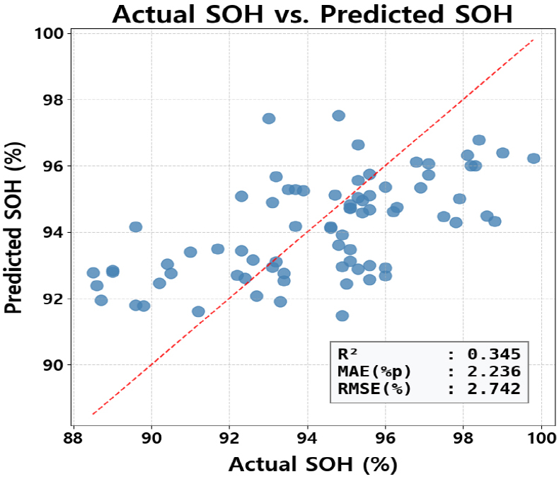 - This study develops an SOH prediction model for electric vehicle batteries using periodic technical inspection data collected under driving conditions. As the EV market expands rapidly, accurate SOH estimation is essential for battery safety management, maintenance optimization, and circular economy policy design. The model employs Ridge regression with L2 regularization to address multicollinearity among key predictors as vehicle age, cumulative mileage, total operating time, and total discharge. Cross-validation results showed MAE=2.24%p and RMSE=2.74%p, outperforming a random forest baseline. Variable importance analysis revealed that age and mileage were the strongest predictors, with calendar aging and cycle aging contributing comparably to SOH degradation. A framework is proposed to estimate time-to-threshold for SOH criteria using daily usage patterns. This supports targeted inspection scheduling, residual value assessment for used EVs, and policy development for battery reuse and recycling. By leveraging large-scale field inspection data, the research bridges the gap between laboratory-based SOH modeling and practical diagnostic applications for EV safety management. - COLLAPSE